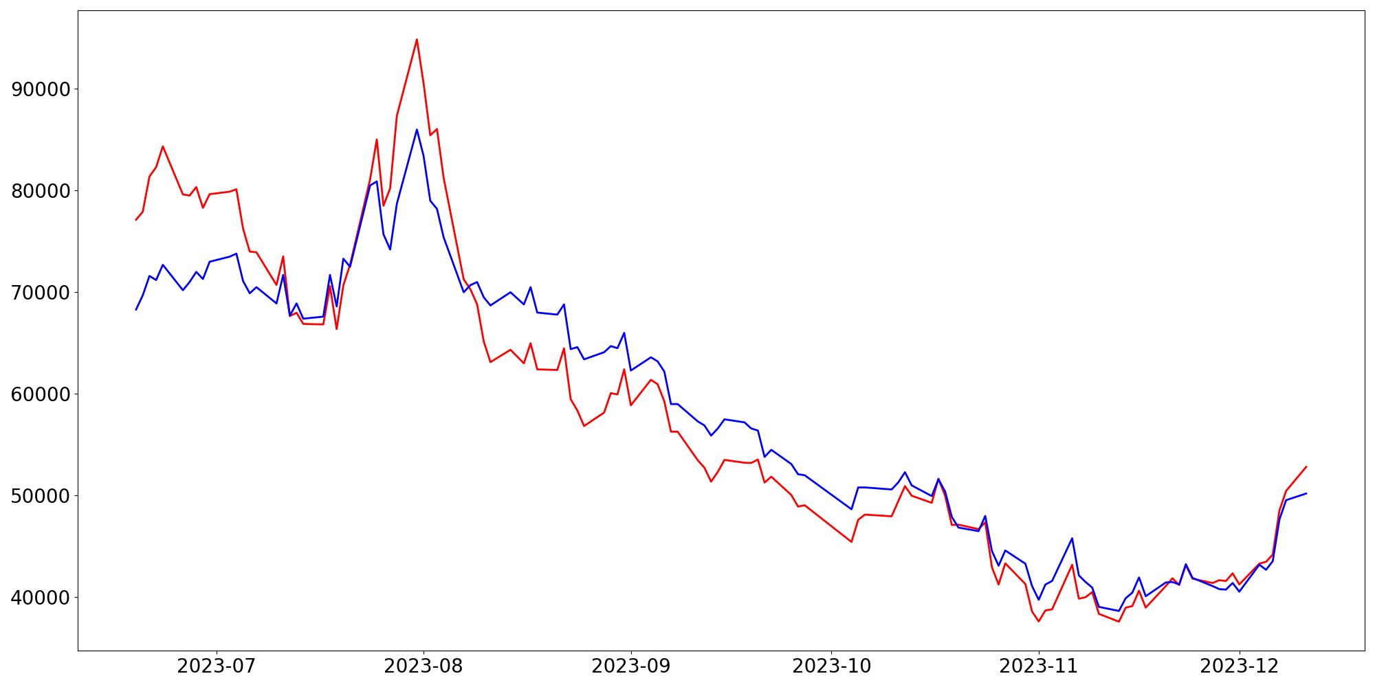 [ - : 실제값(종가) / - : 예측값(종가) ]