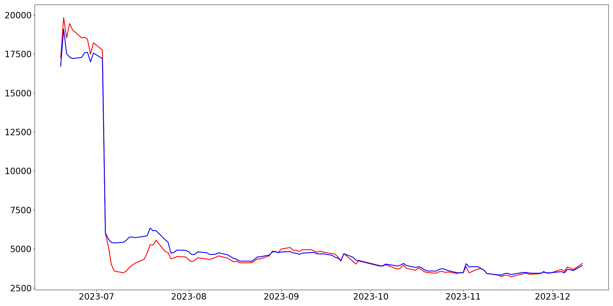 [ - : 실제값(종가) / - : 예측값(종가) ]