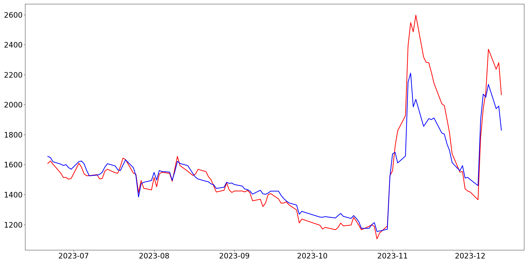 [ - : 실제값(종가) / - : 예측값(종가) ]