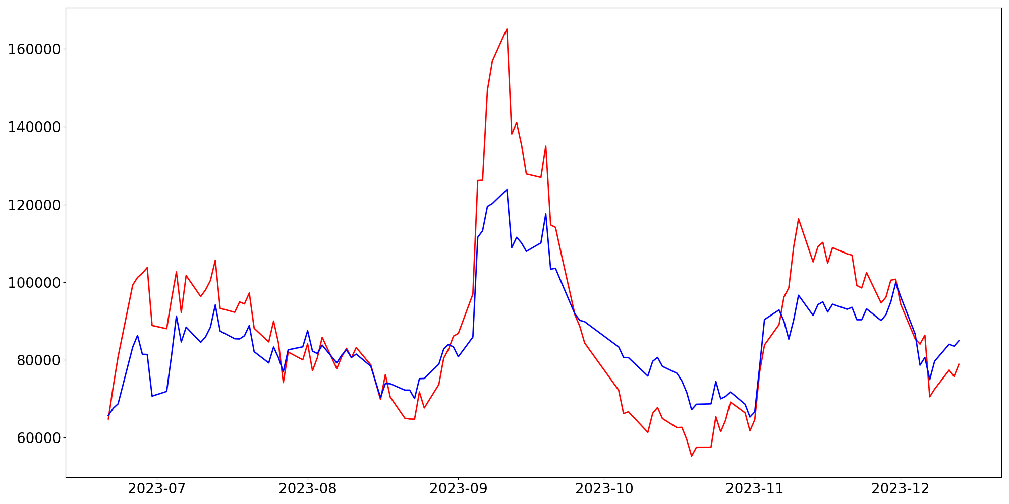[ - : 실제값(종가) / - : 예측값(종가) ]