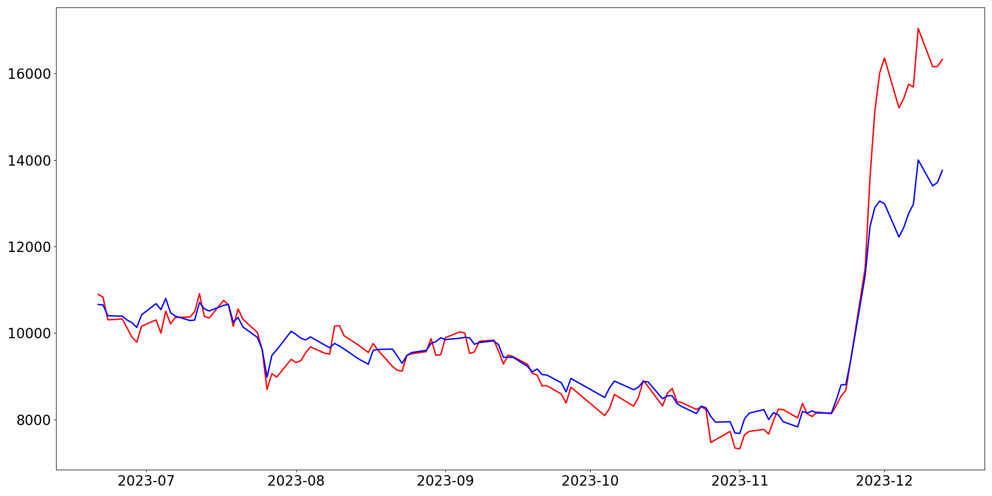 [ - : 실제값(종가) / - : 예측값(종가) ]