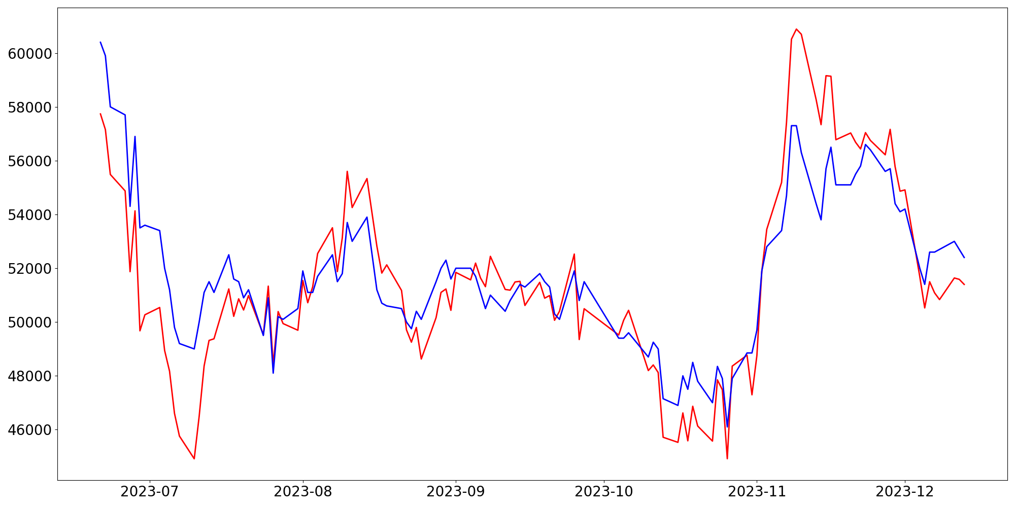 [ - : 실제값(종가) / - : 예측값(종가) ]