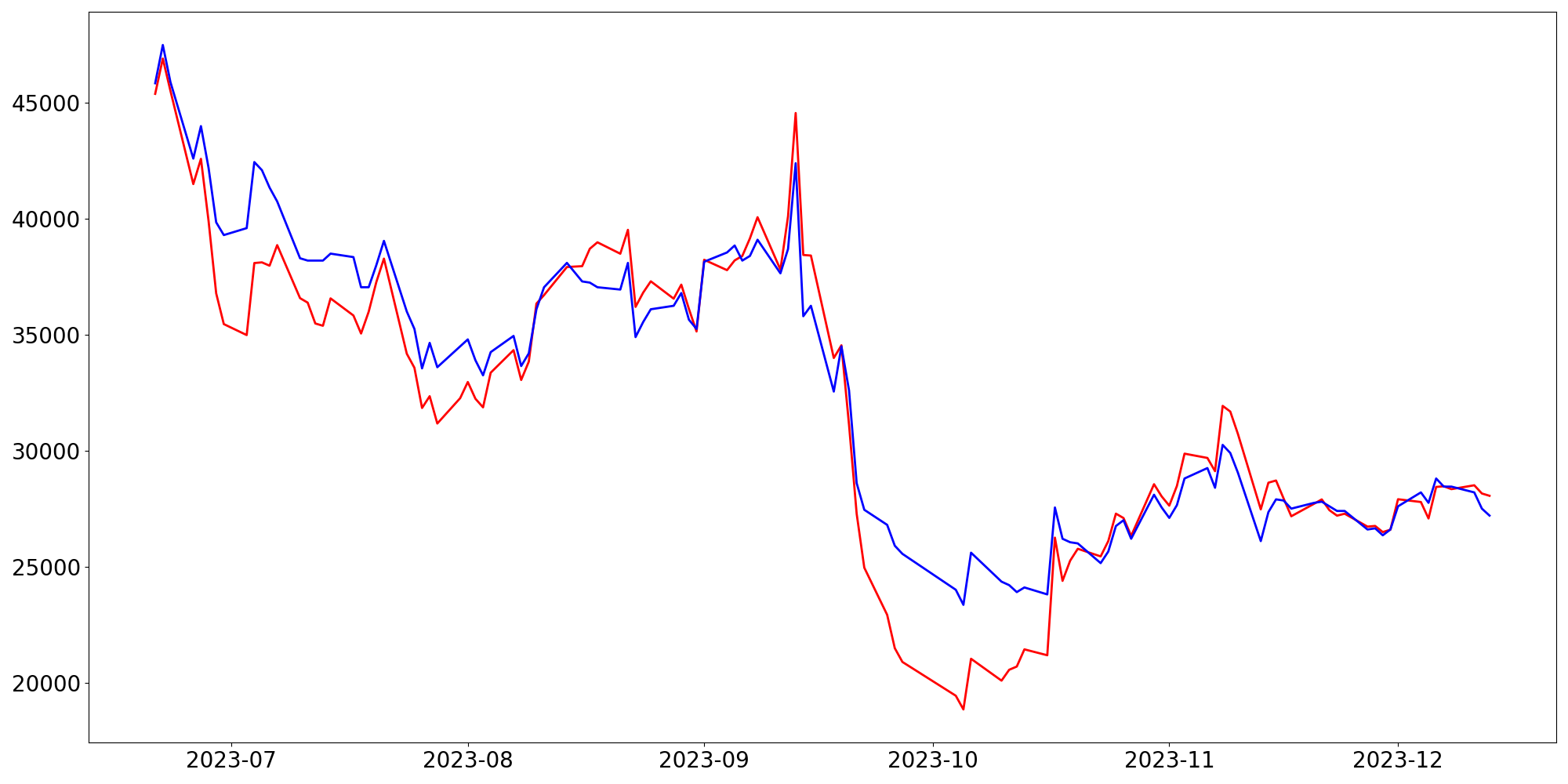 [ - : 실제값(종가) / - : 예측값(종가) ]