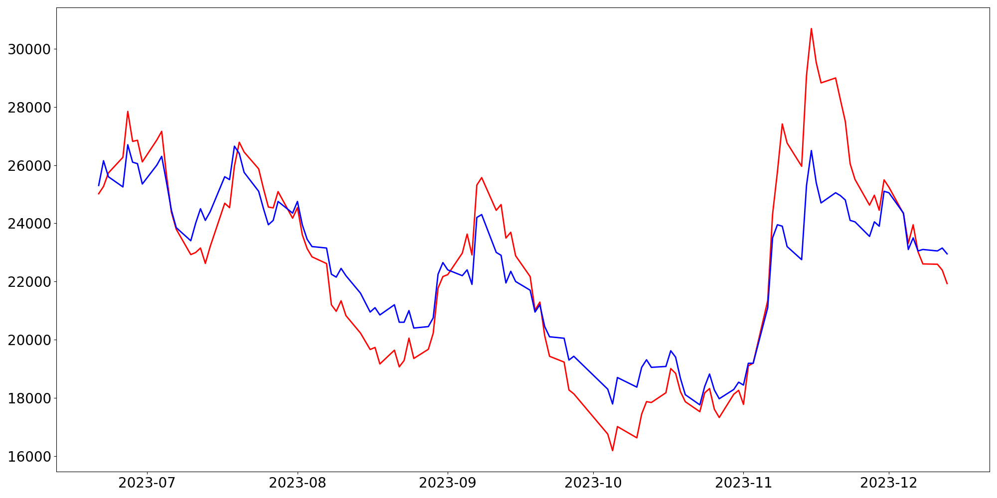 [ - : 실제값(종가) / - : 예측값(종가) ]