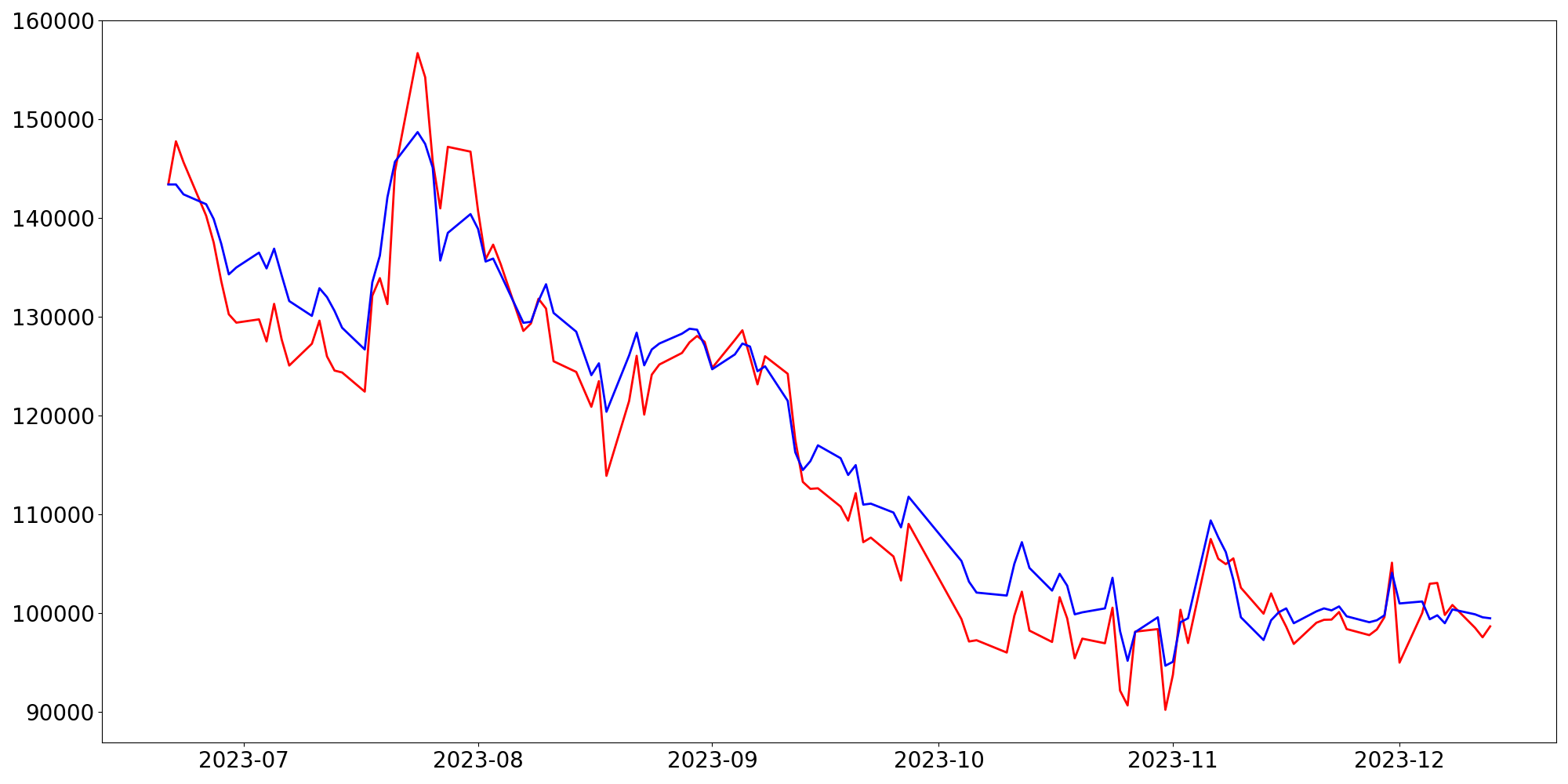 [ - : 실제값(종가) / - : 예측값(종가) ]
