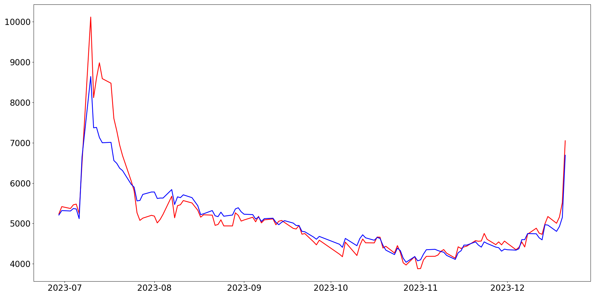[ - : 실제값(종가) / - : 예측값(종가) ]