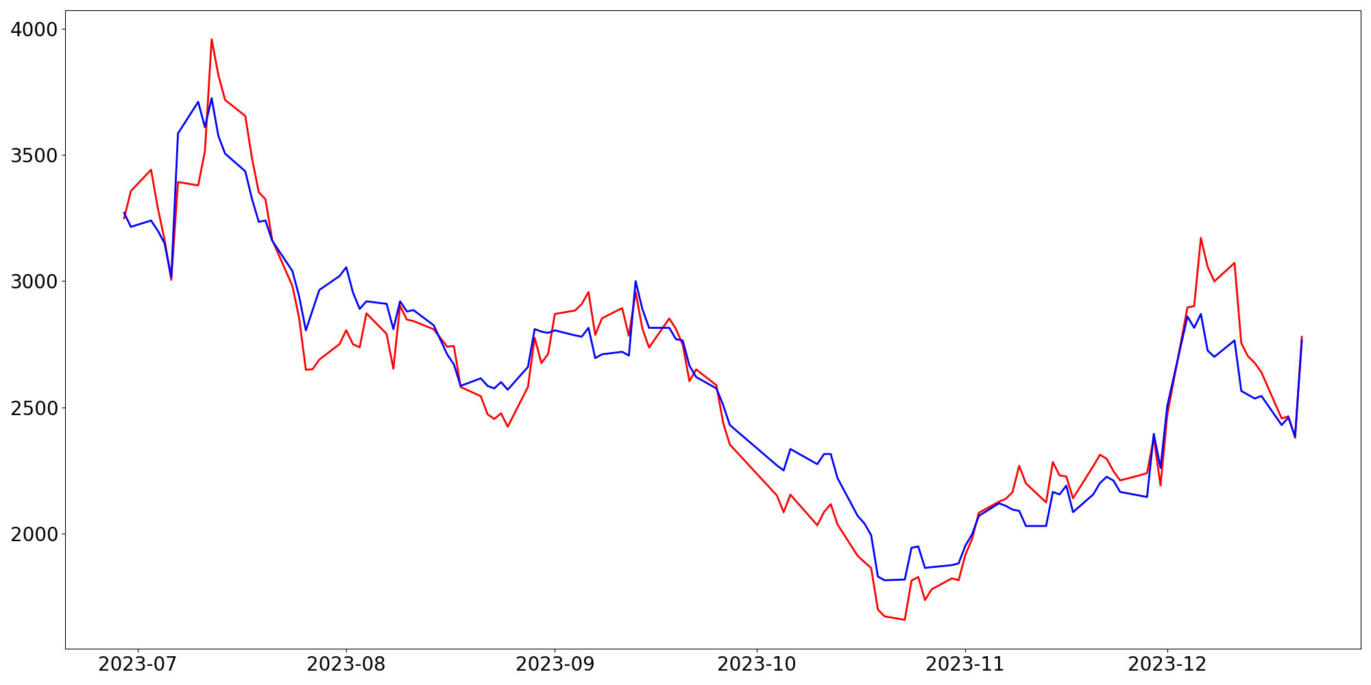 [ - : 실제값(종가) / - : 예측값(종가) ]