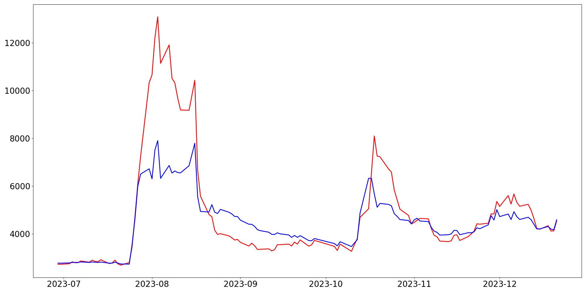 [ - : 실제값(종가) / - : 예측값(종가) ]