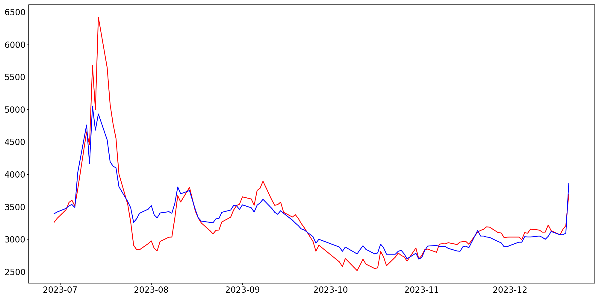 [ - : 실제값(종가) / - : 예측값(종가) ]