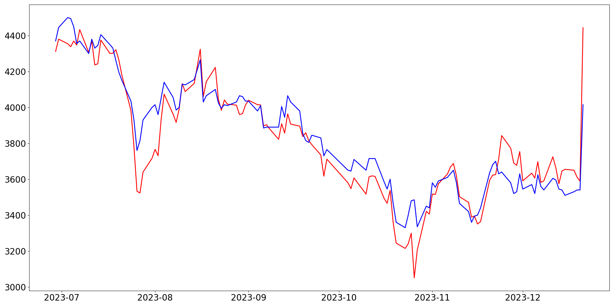 [ - : 실제값(종가) / - : 예측값(종가) ]