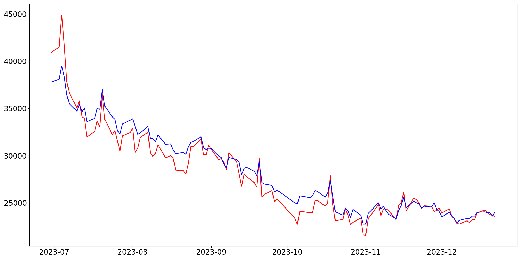 [ - : 실제값(종가) / - : 예측값(종가) ]
