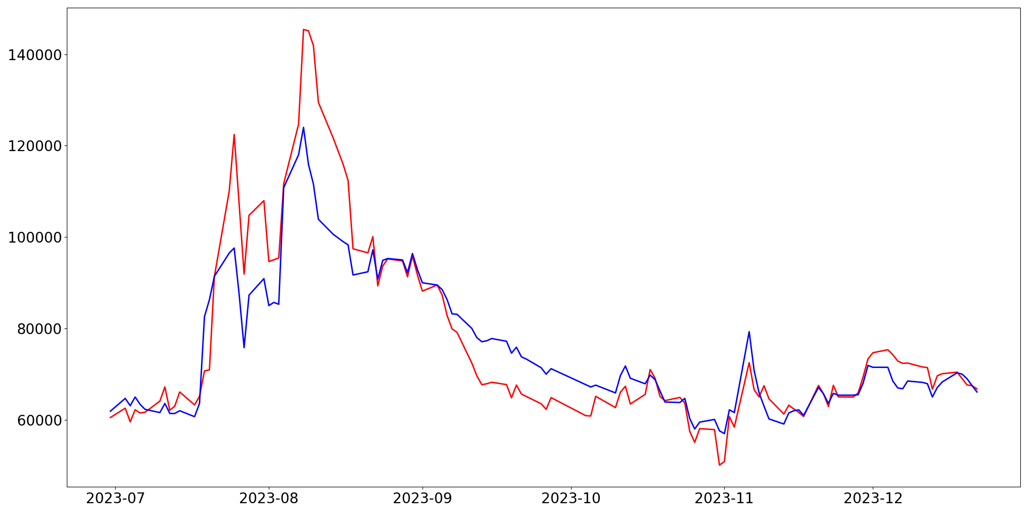 [ - : 실제값(종가) / - : 예측값(종가) ]