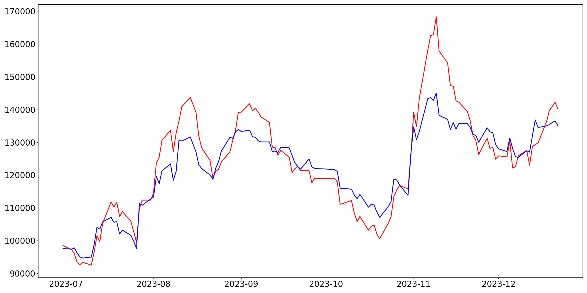 [ - : 실제값(종가) / - : 예측값(종가) ]