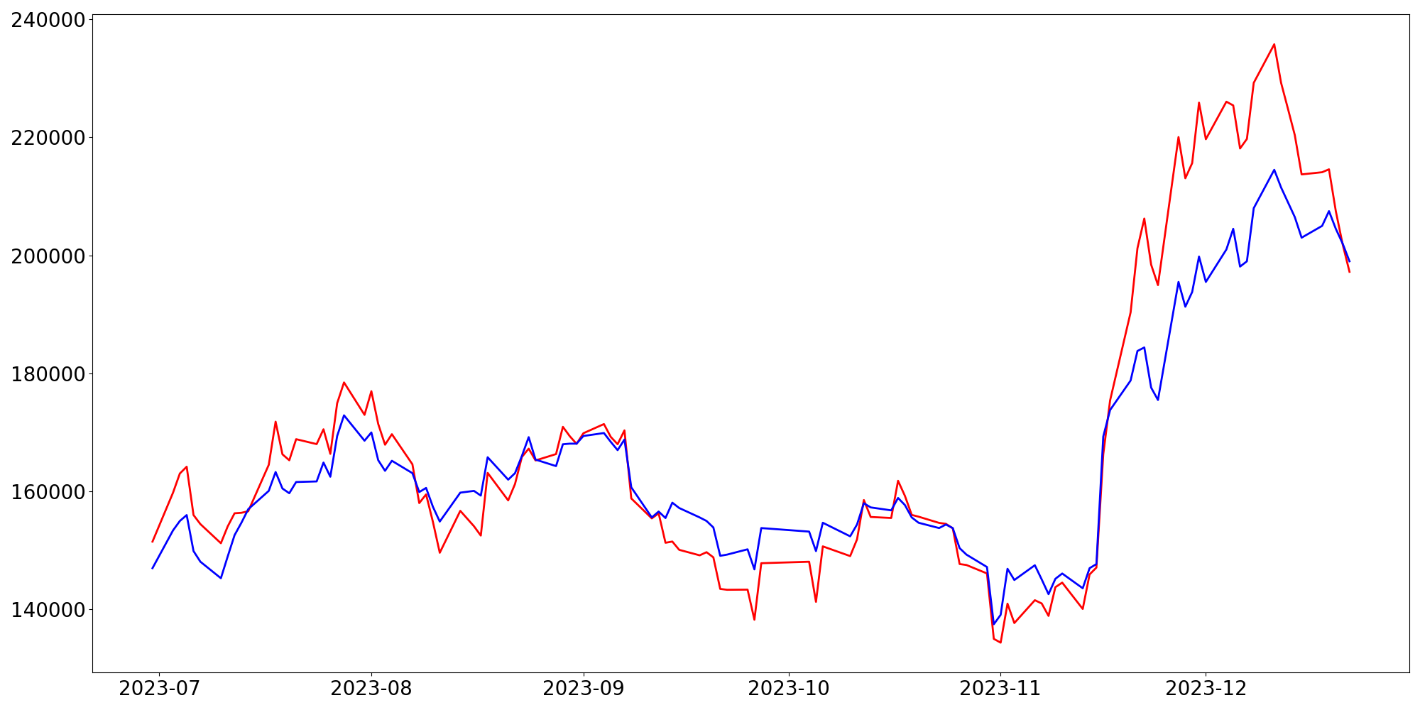 [ - : 실제값(종가) / - : 예측값(종가) ]