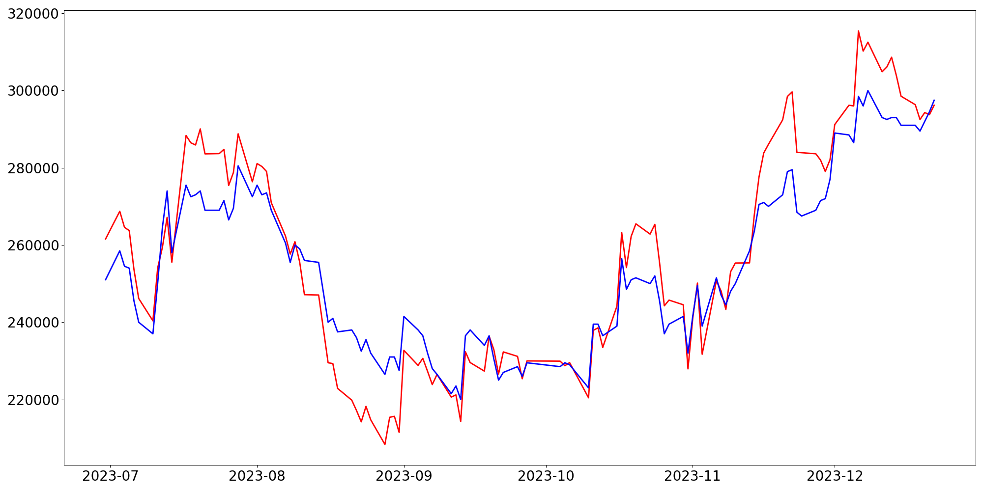 [ - : 실제값(종가) / - : 예측값(종가) ]