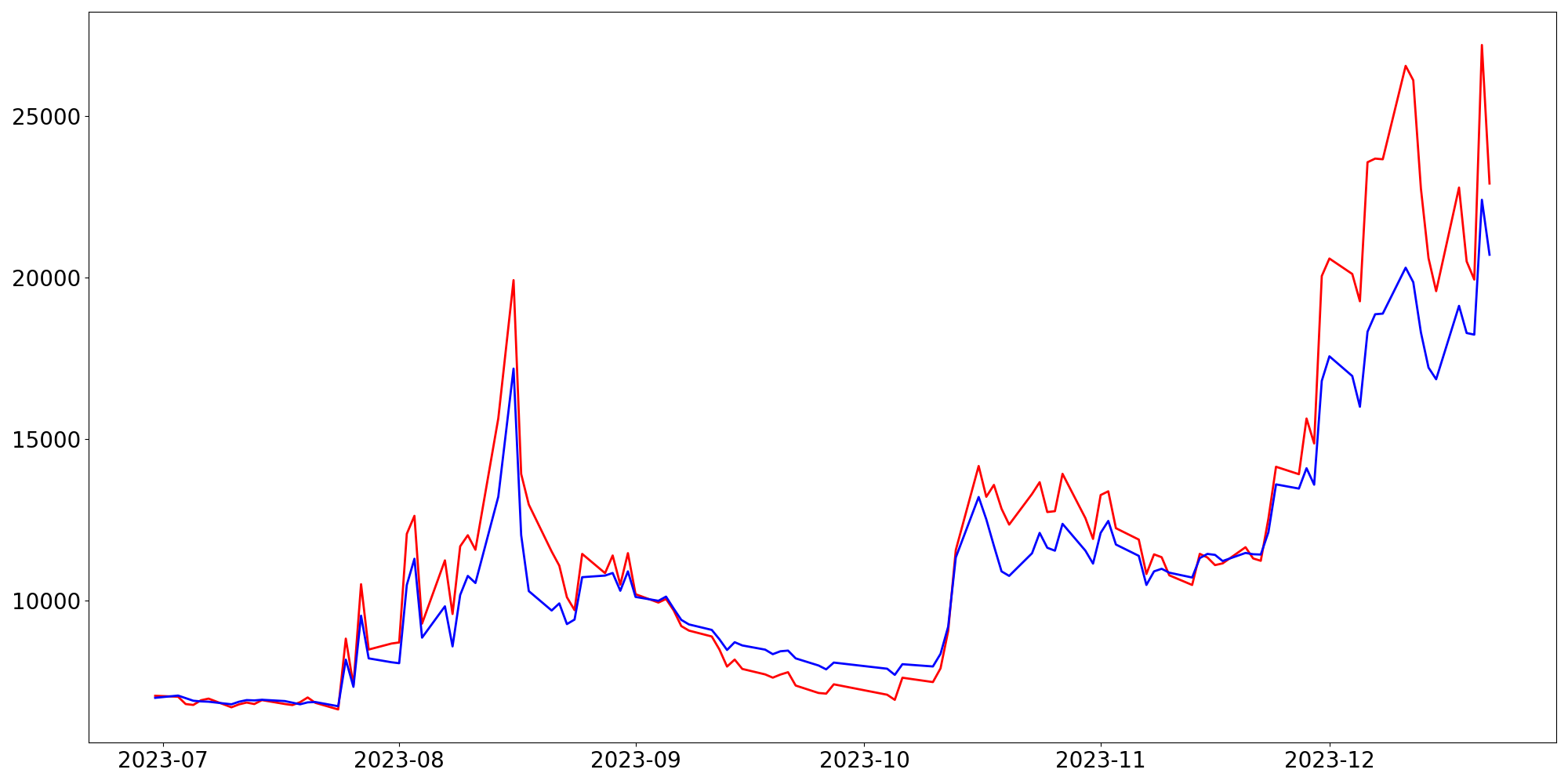 [ - : 실제값(종가) / - : 예측값(종가) ]