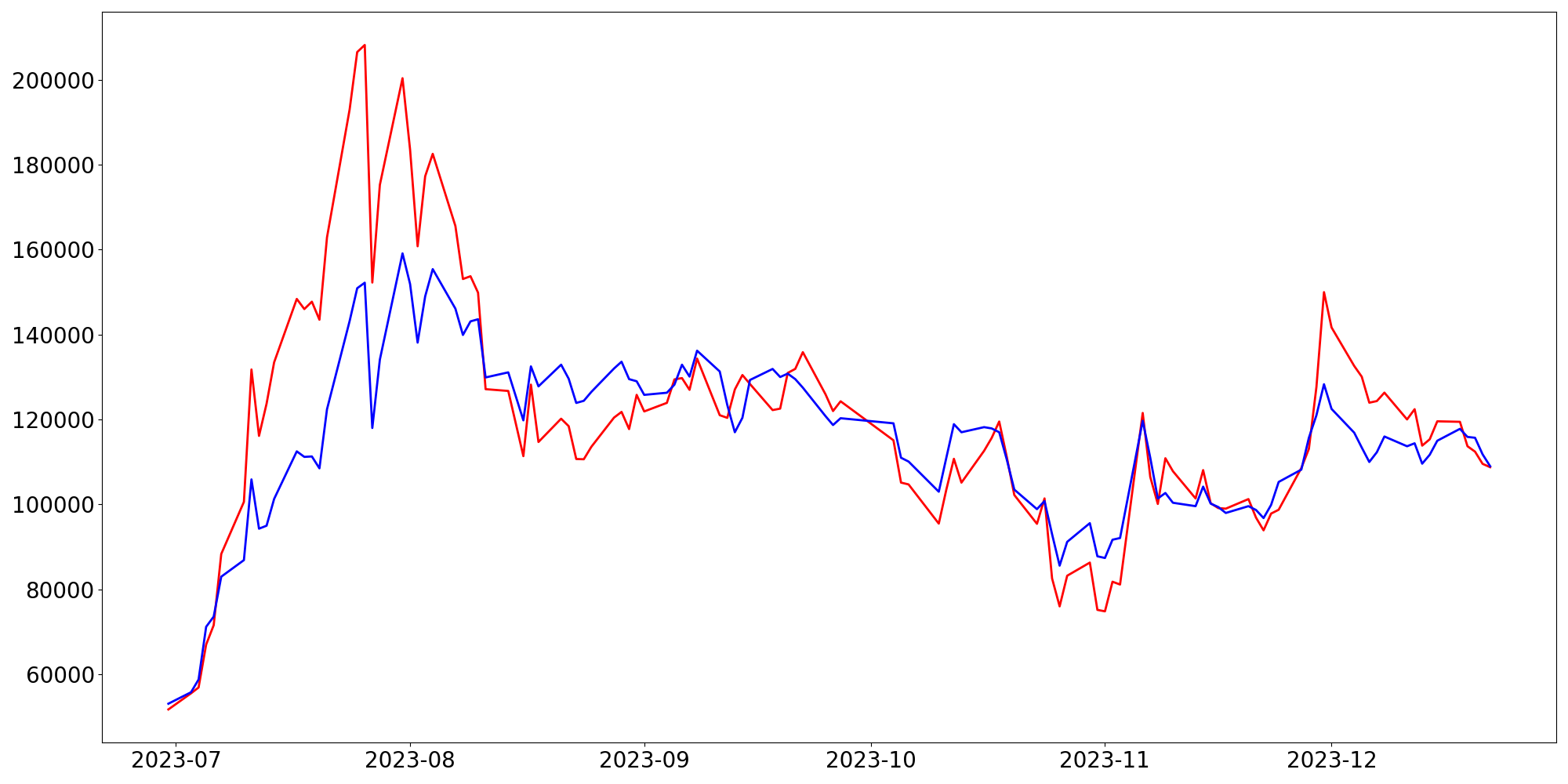 [ - : 실제값(종가) / - : 예측값(종가) ]