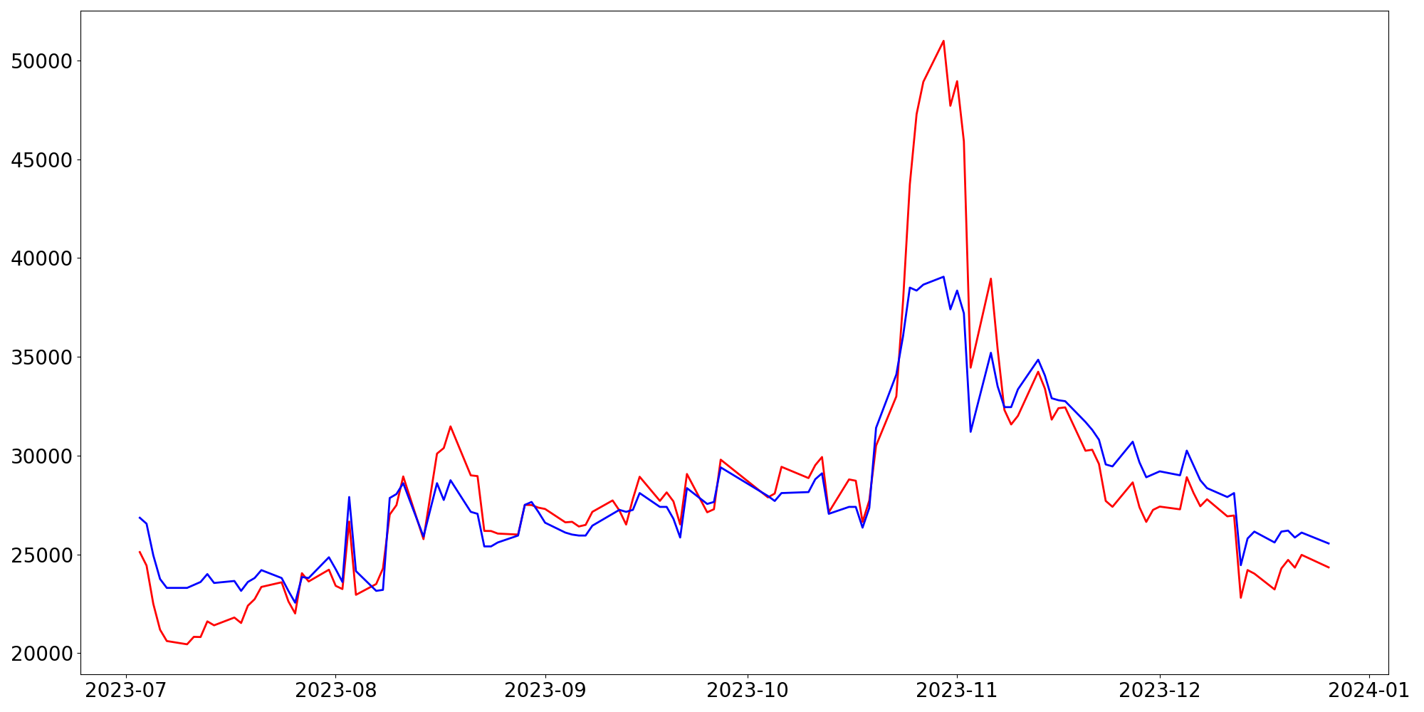 [ - : 실제값(종가) / - : 예측값(종가) ]