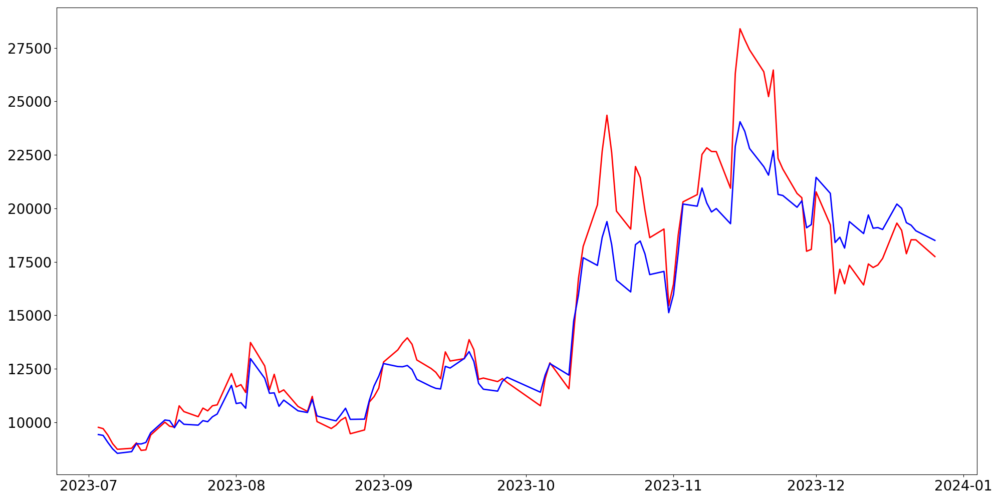 [ - : 실제값(종가) / - : 예측값(종가) ]