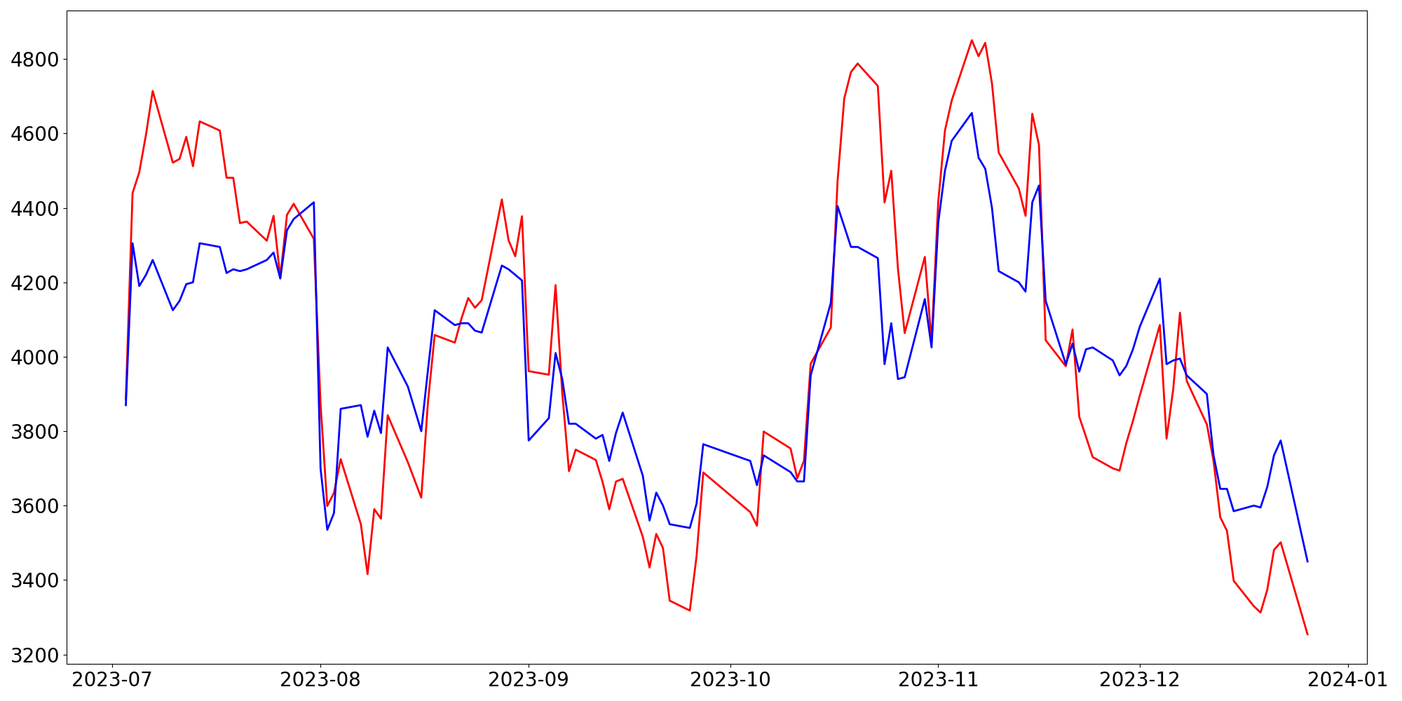 [ - : 실제값(종가) / - : 예측값(종가) ]