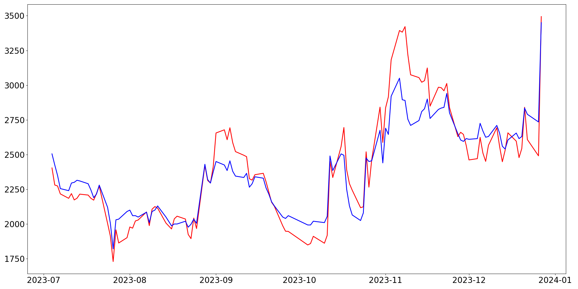 [ - : 실제값(종가) / - : 예측값(종가) ]