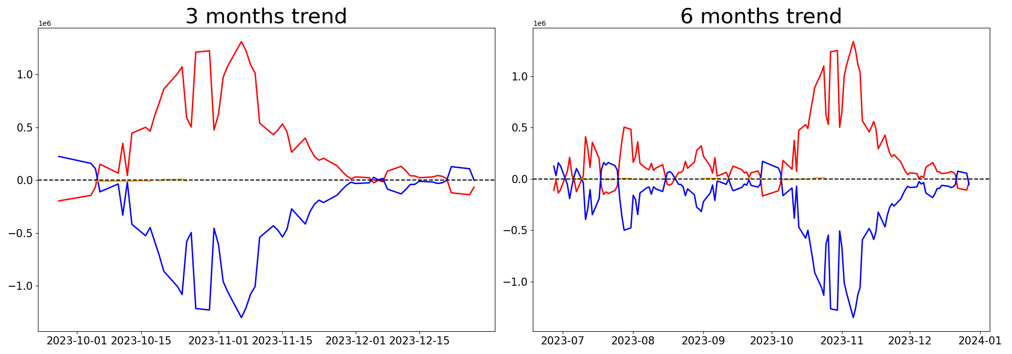 기관, 개인, 외국인으로 분류하여 투자주체별 일정기간동안의 누적적 매수/매도 현황을 분석한 내용입니다. 특정일의 투자자별 매매동향을 통해서 단기간의 시장충격여부를 판단할 수 있으며 장기적인 매매동향을 통해서 해당 종목의 장기 모멘텀을 판단해 볼 수 있습니다.