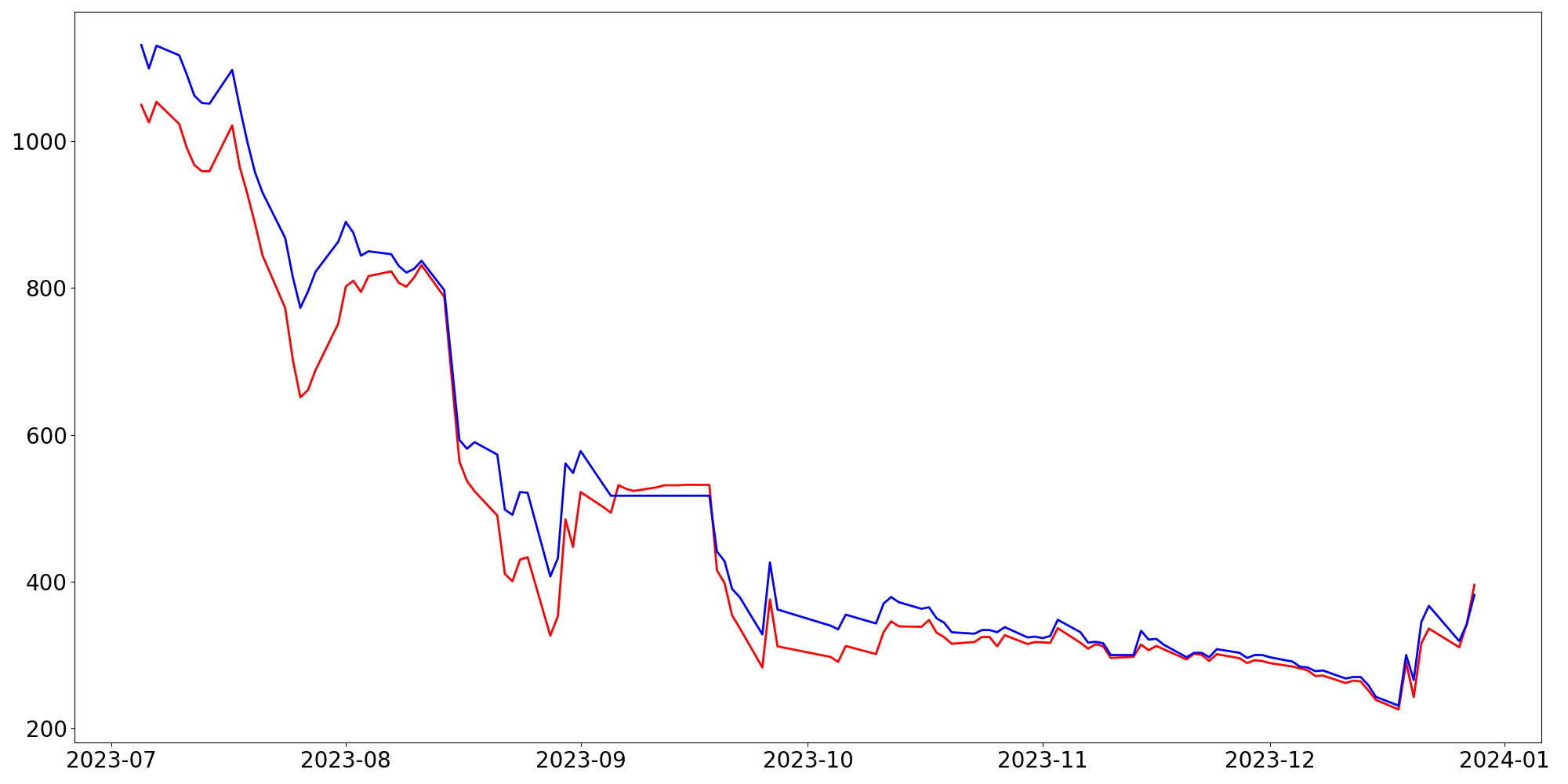 [ - : 실제값(종가) / - : 예측값(종가) ]