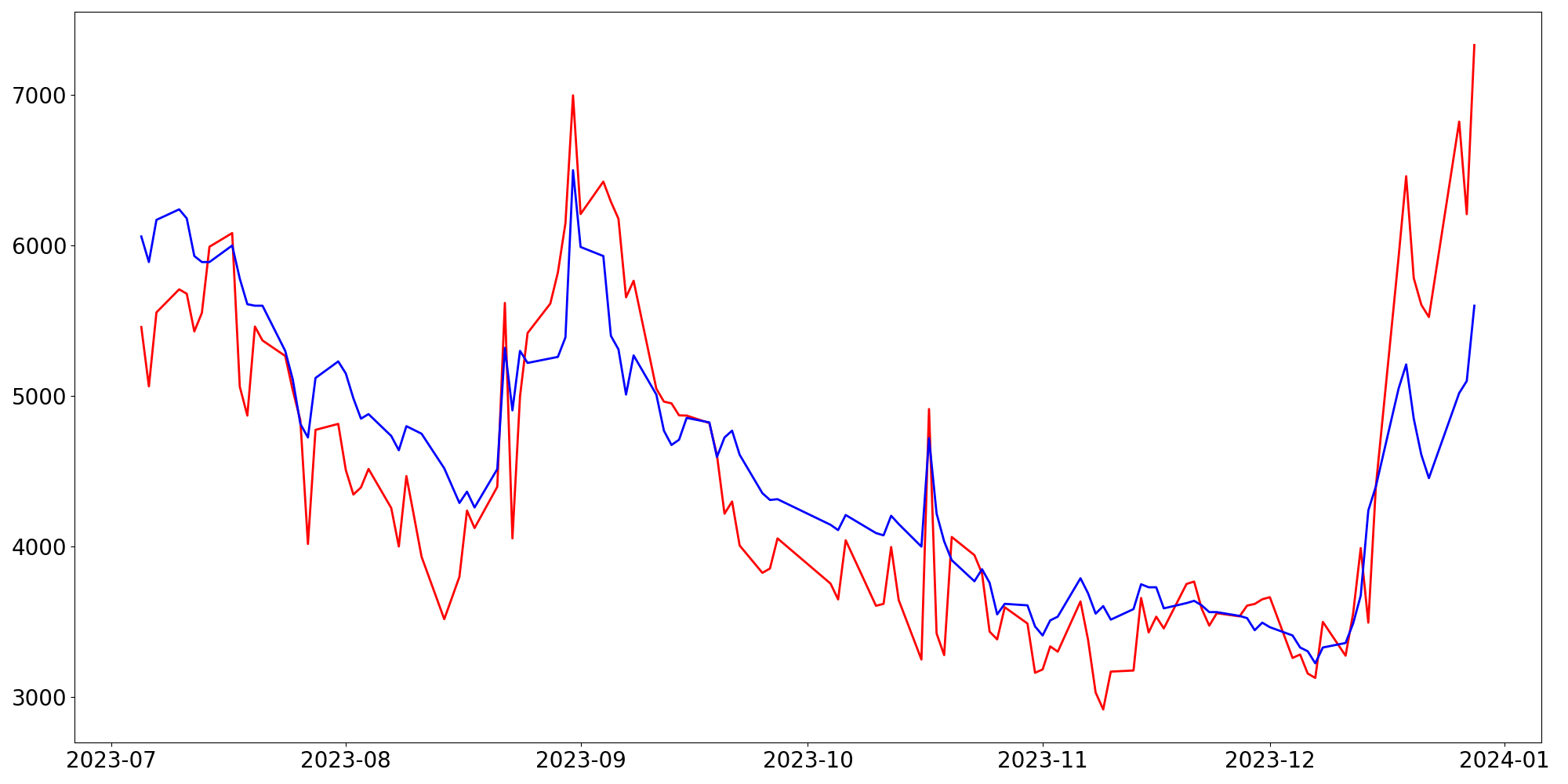 [ - : 실제값(종가) / - : 예측값(종가) ]
