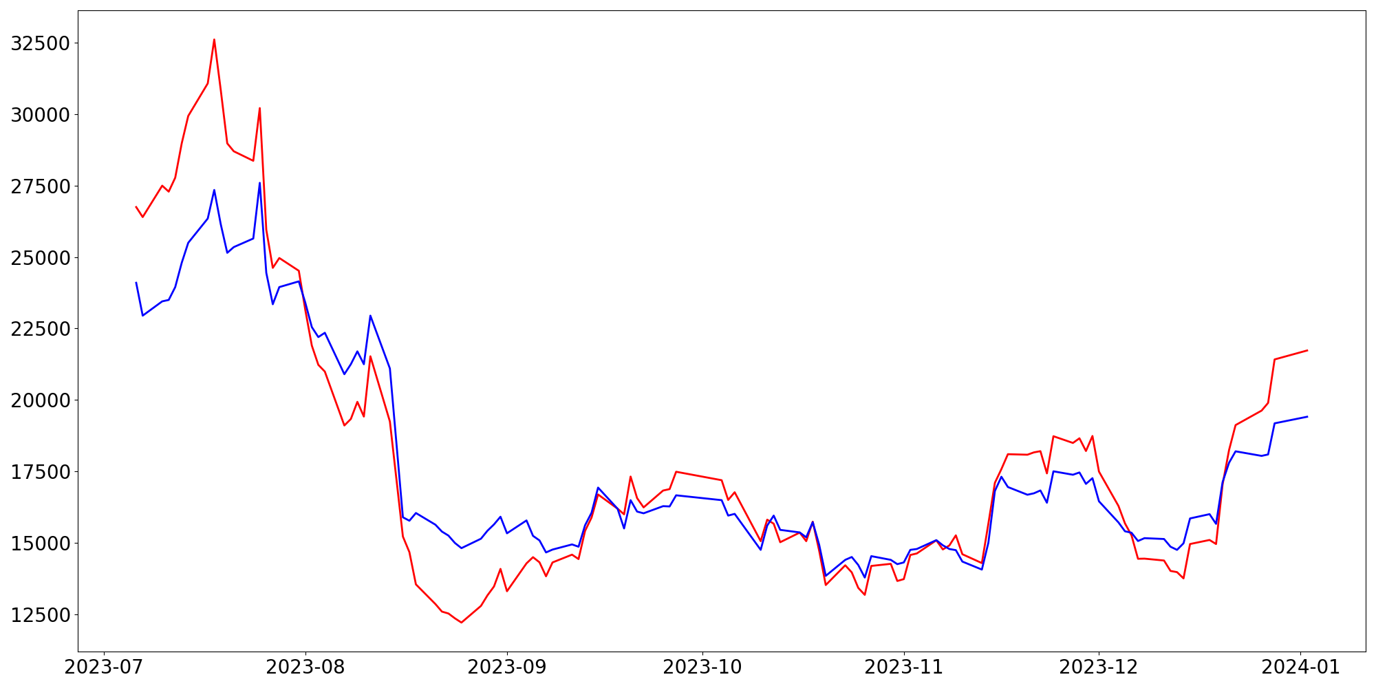 [ - : 실제값(종가) / - : 예측값(종가) ]