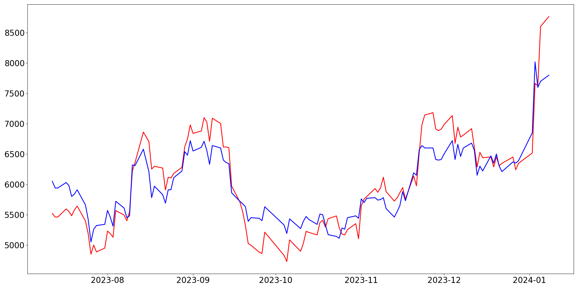 [ - : 실제값(종가) / - : 예측값(종가) ]
