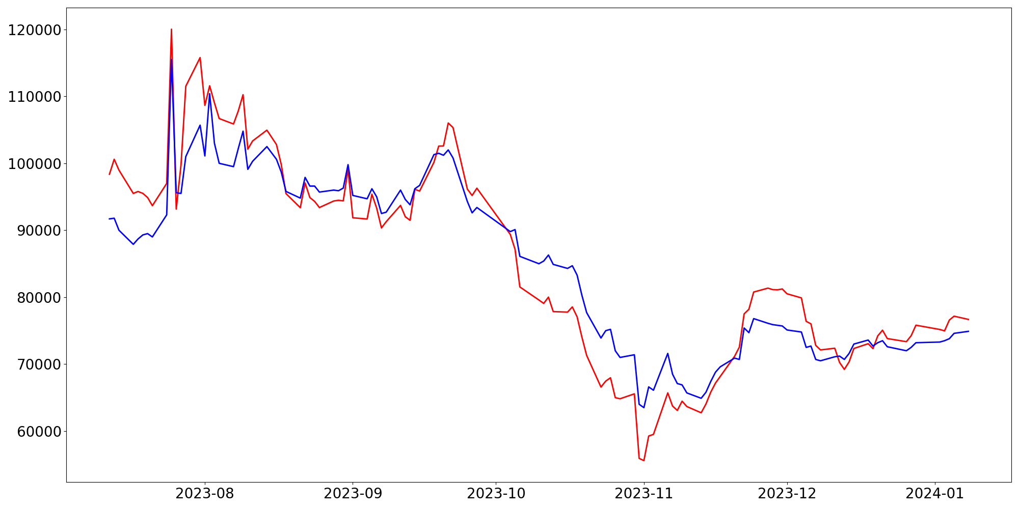 [ - : 실제값(종가) / - : 예측값(종가) ]