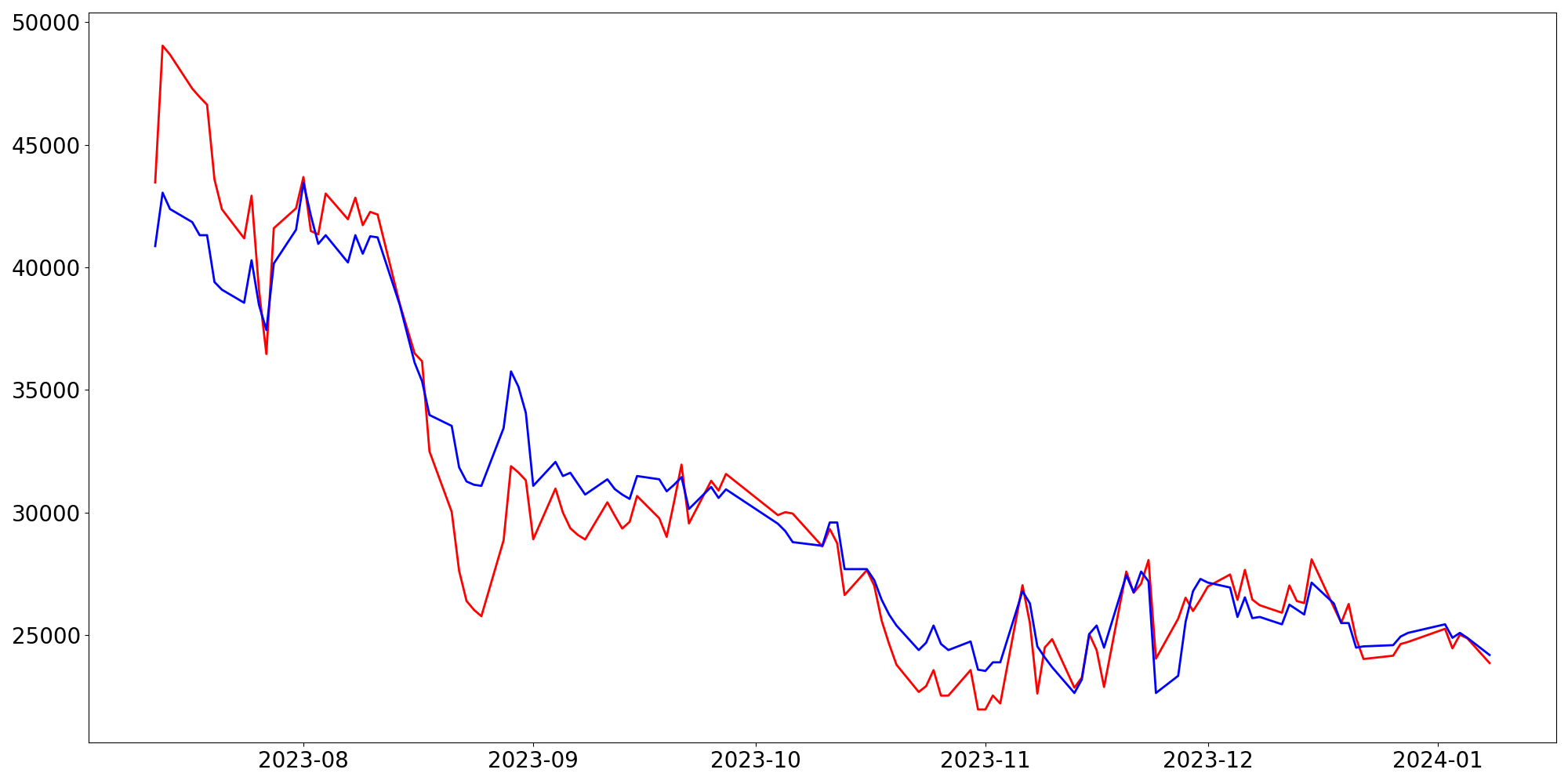 [ - : 실제값(종가) / - : 예측값(종가) ]