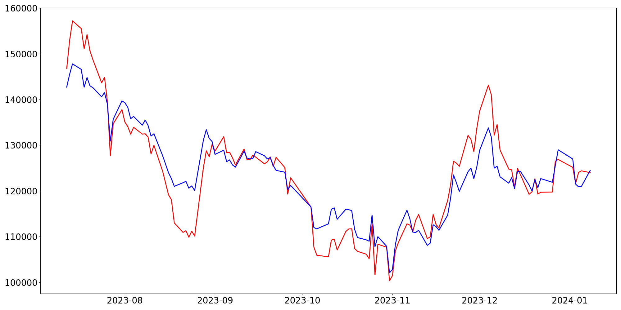 [ - : 실제값(종가) / - : 예측값(종가) ]