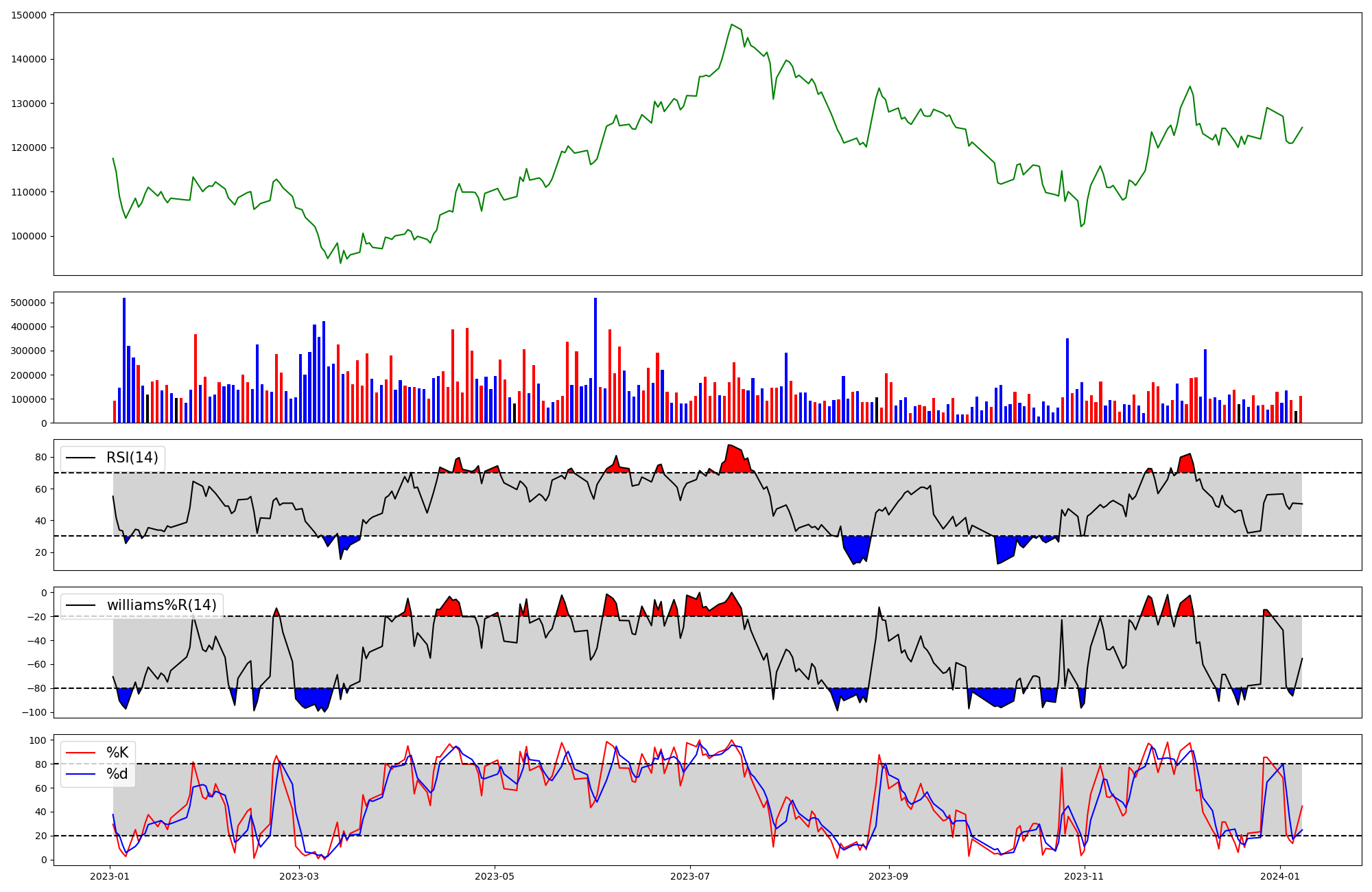 □ 중기 : 현재 종가가 중기(60일) 이동평균값(117,897원)을 상회 하여 중기적 추세 상승 중
