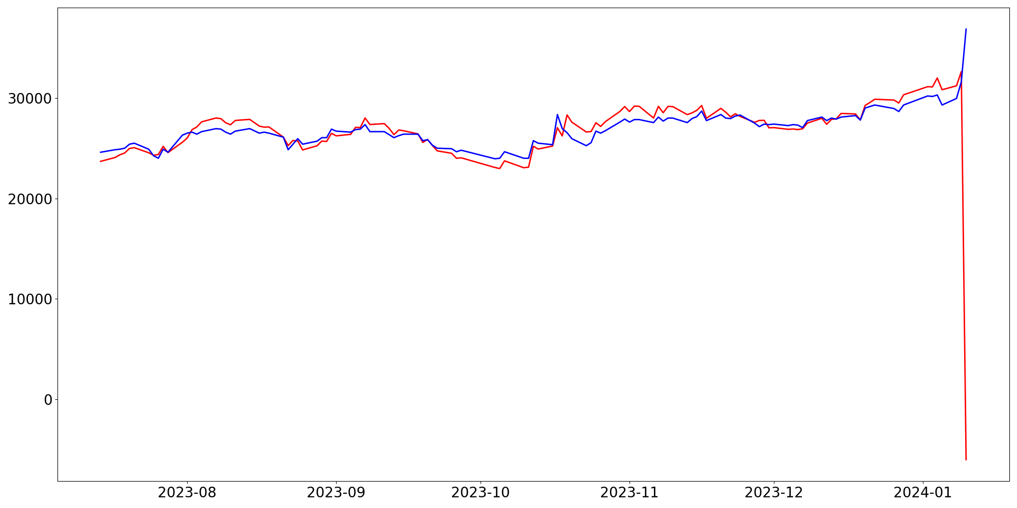 [ - : 실제값(종가) / - : 예측값(종가) ]