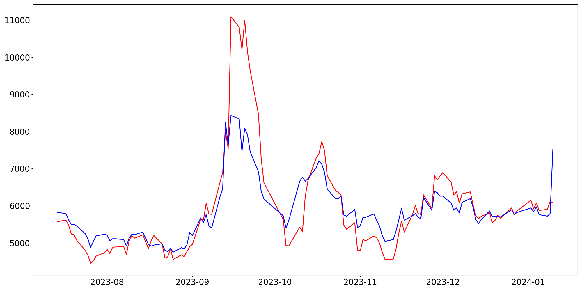 [ - : 실제값(종가) / - : 예측값(종가) ]