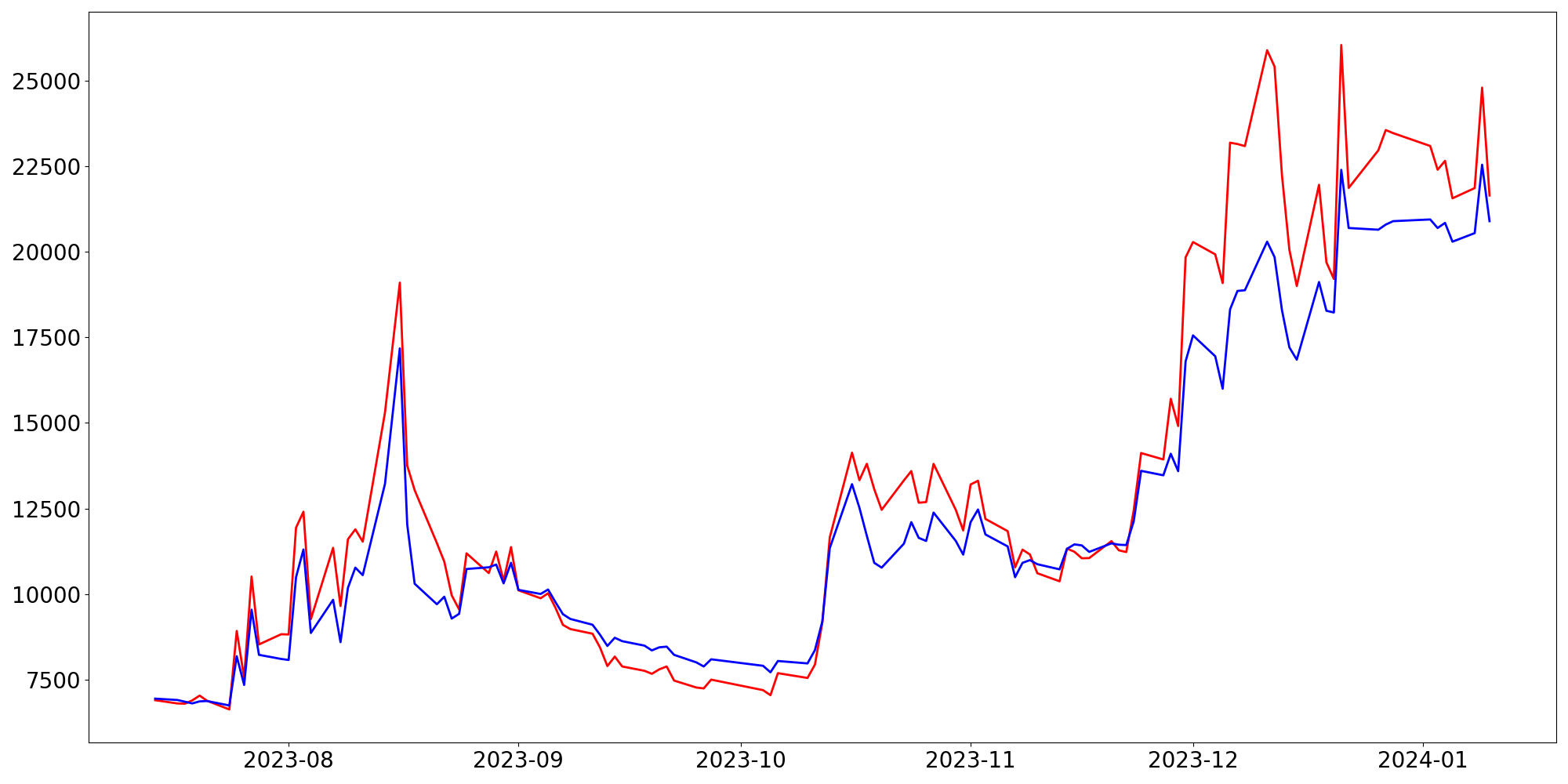[ - : 실제값(종가) / - : 예측값(종가) ]