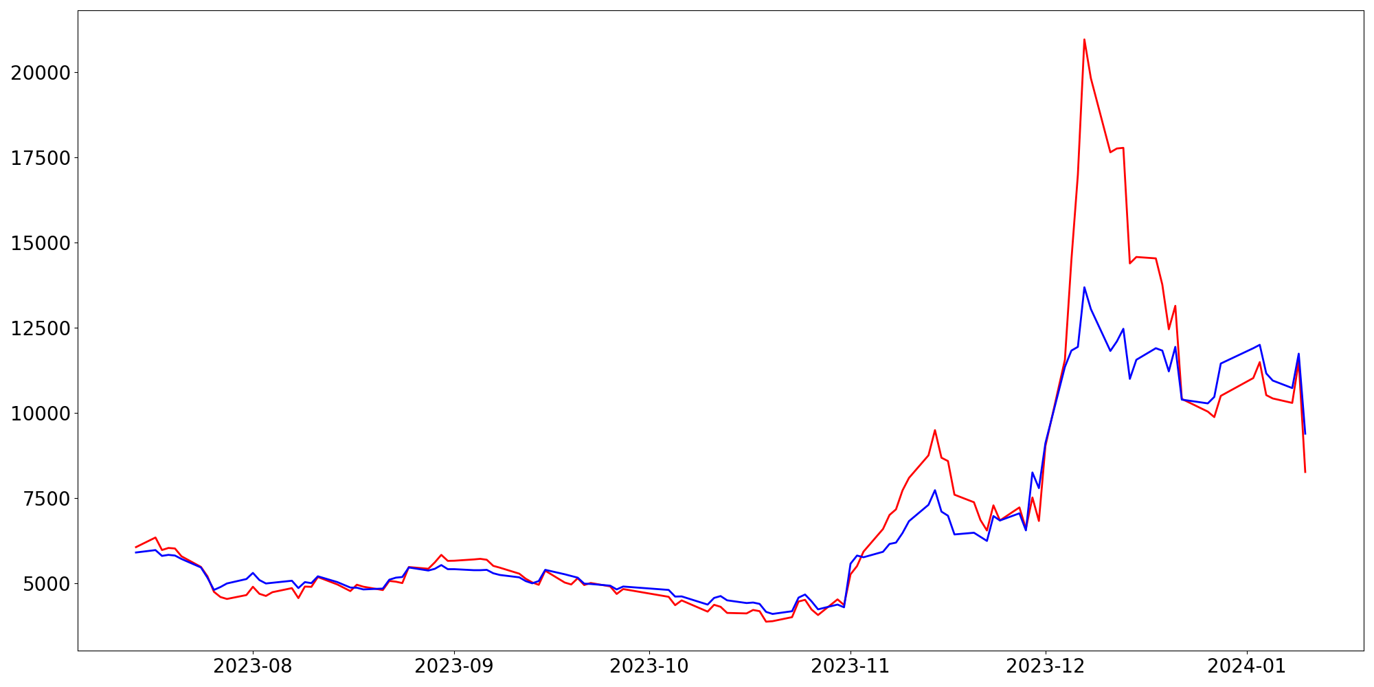 [ - : 실제값(종가) / - : 예측값(종가) ]