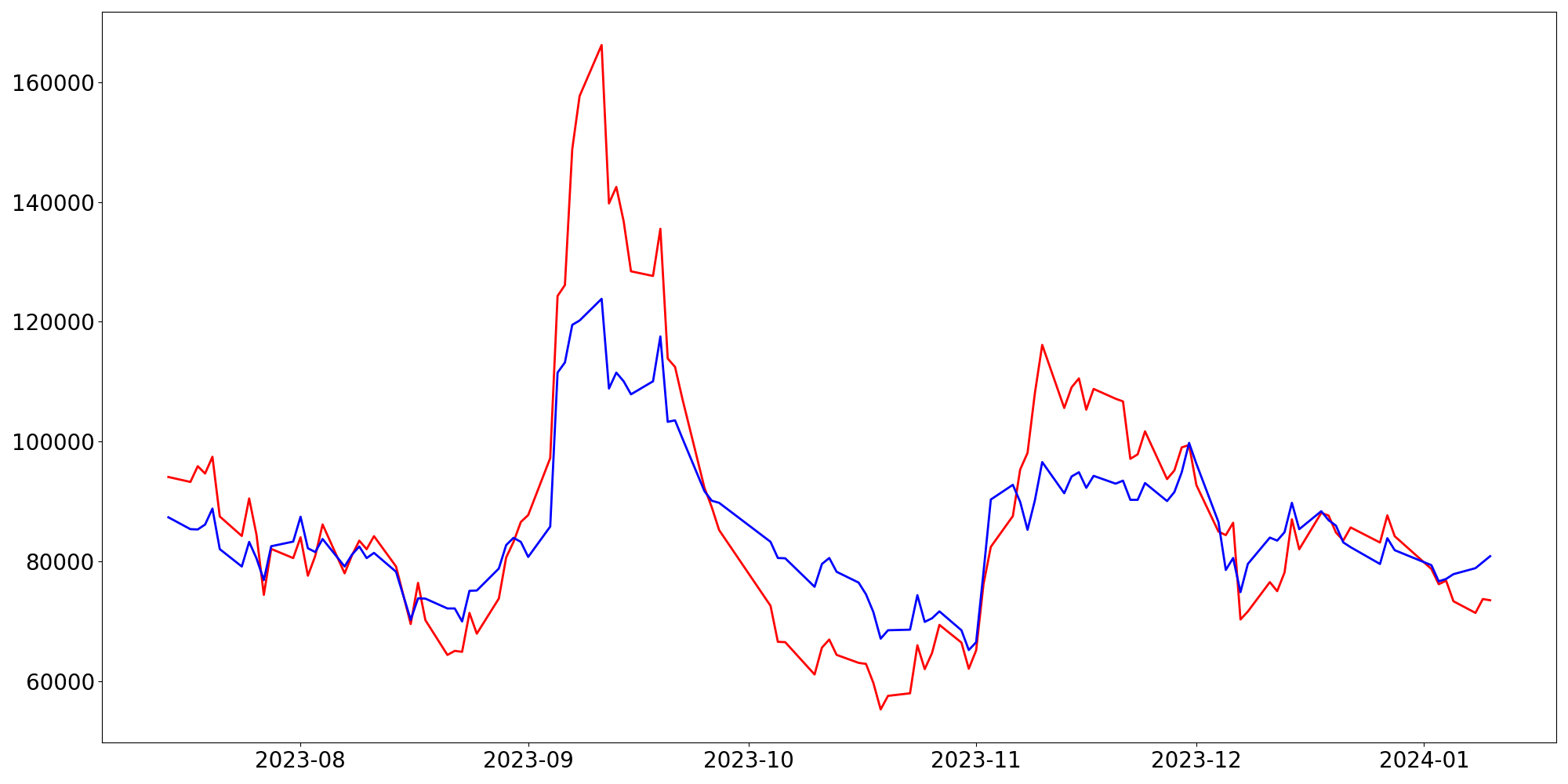 [ - : 실제값(종가) / - : 예측값(종가) ]
