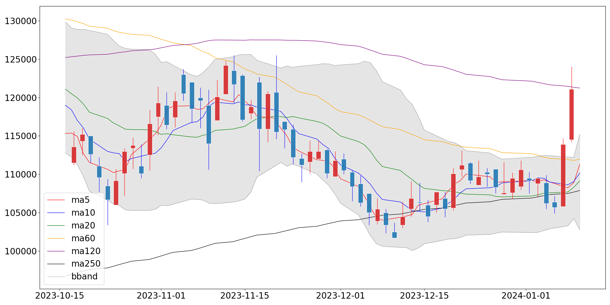 □ 중기 : 현재 종가가 중기(60일) 이동평균값(111,953원)을 상회 하여 중기적 추세 상승 중