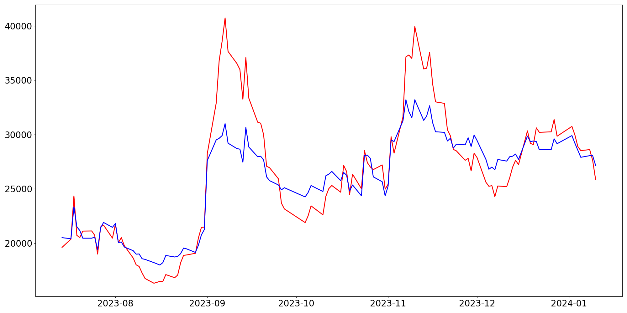 [ - : 실제값(종가) / - : 예측값(종가) ]