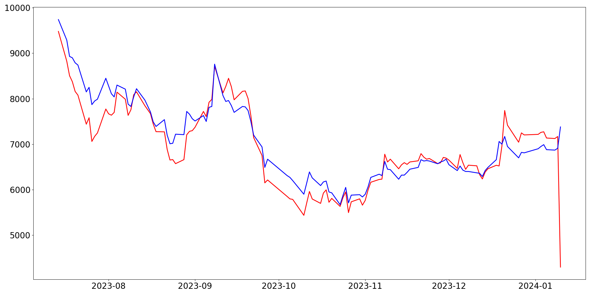 [ - : 실제값(종가) / - : 예측값(종가) ]
