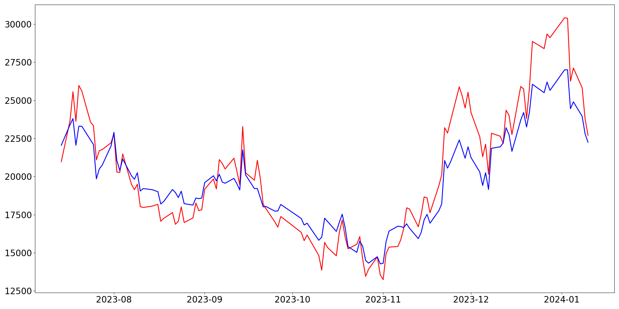 [ - : 실제값(종가) / - : 예측값(종가) ]