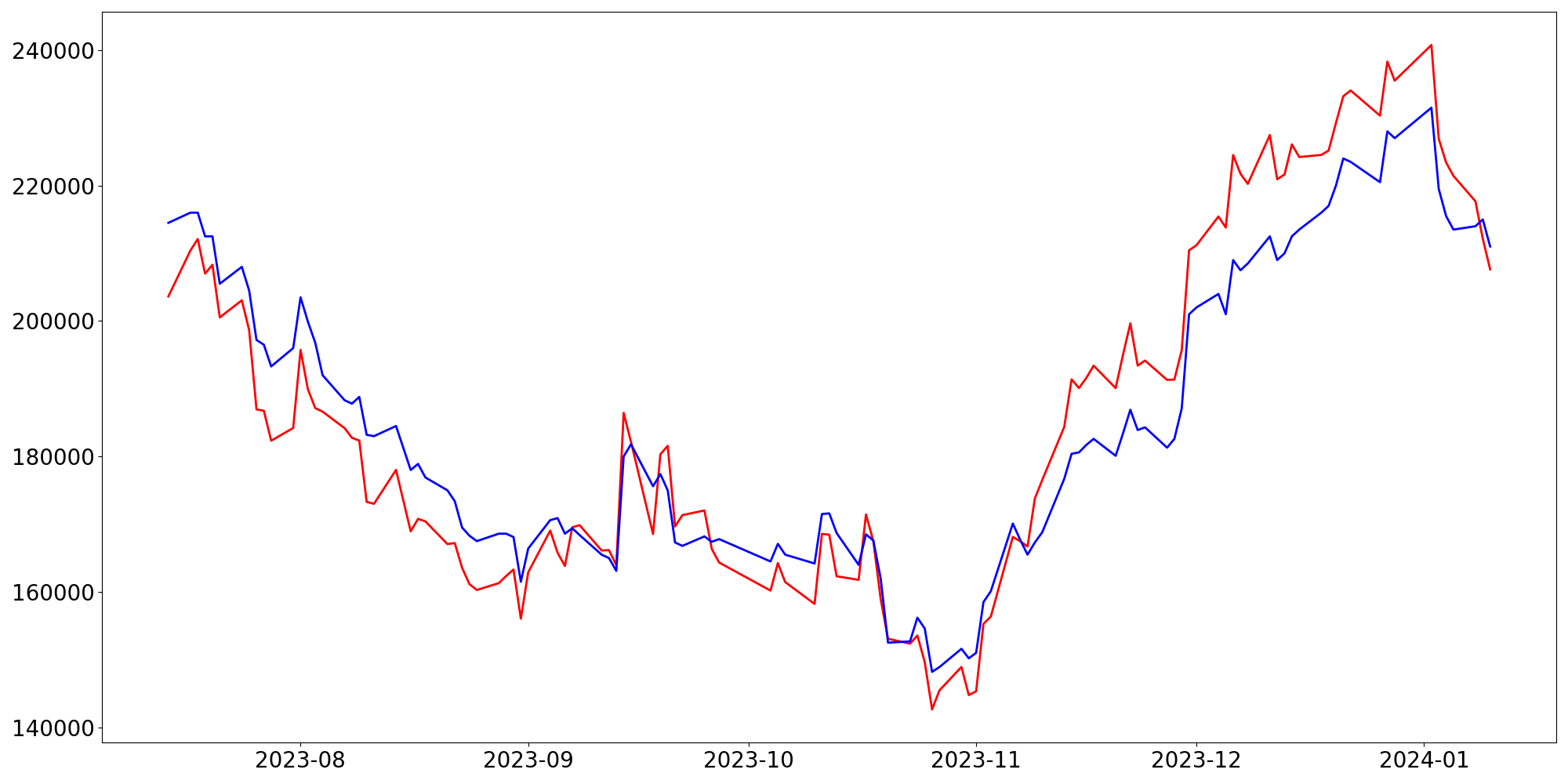 [ - : 실제값(종가) / - : 예측값(종가) ]