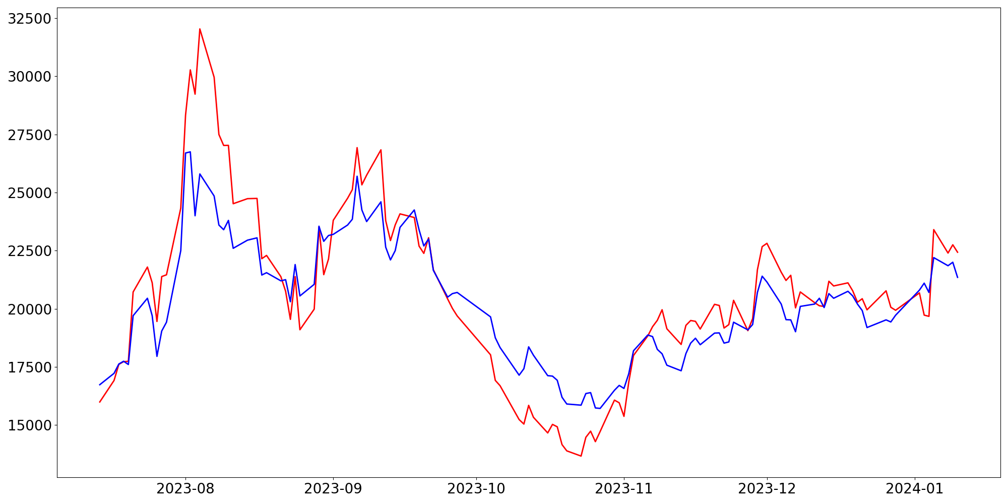[ - : 실제값(종가) / - : 예측값(종가) ]