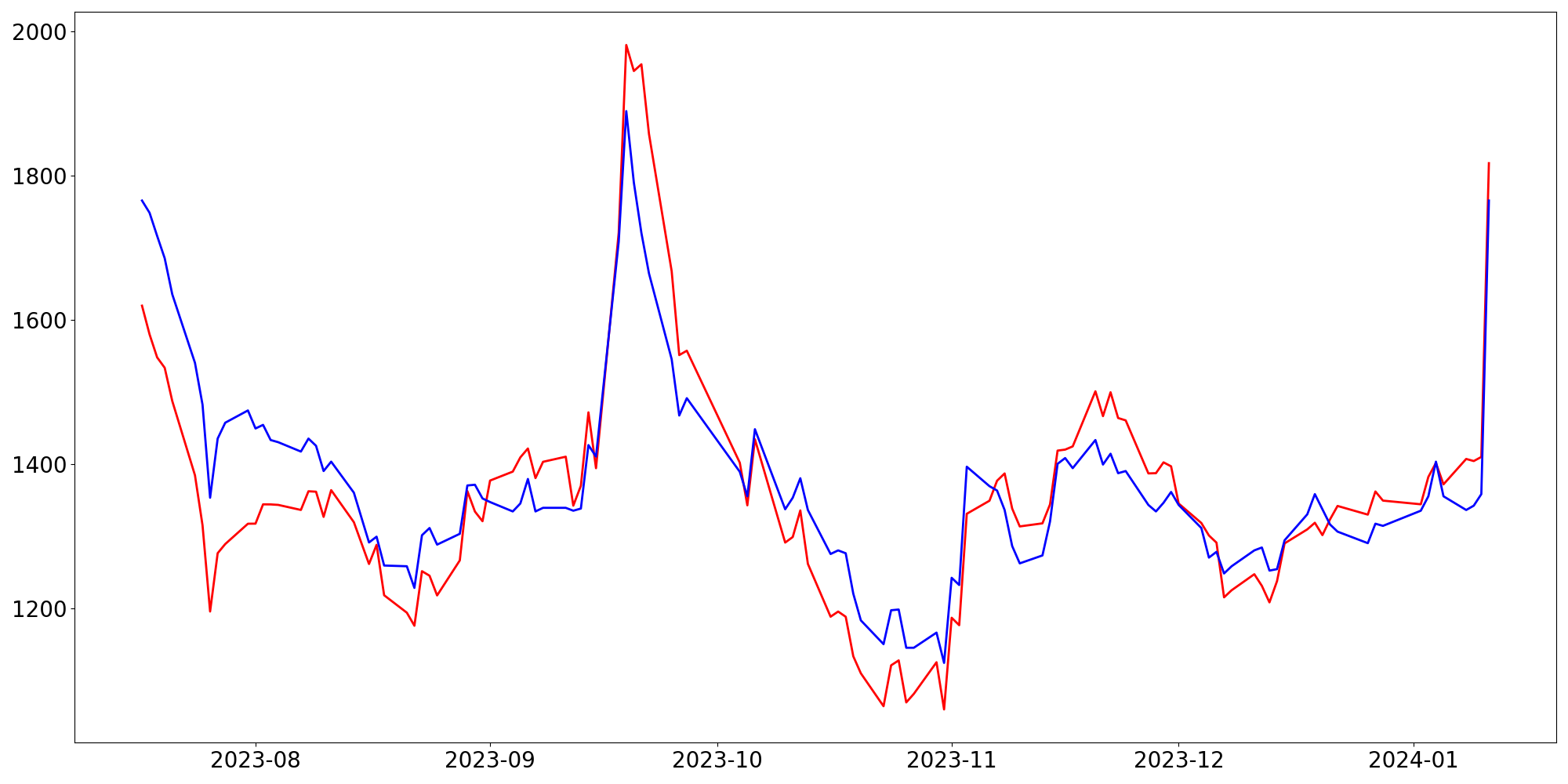 [ - : 실제값(종가) / - : 예측값(종가) ]