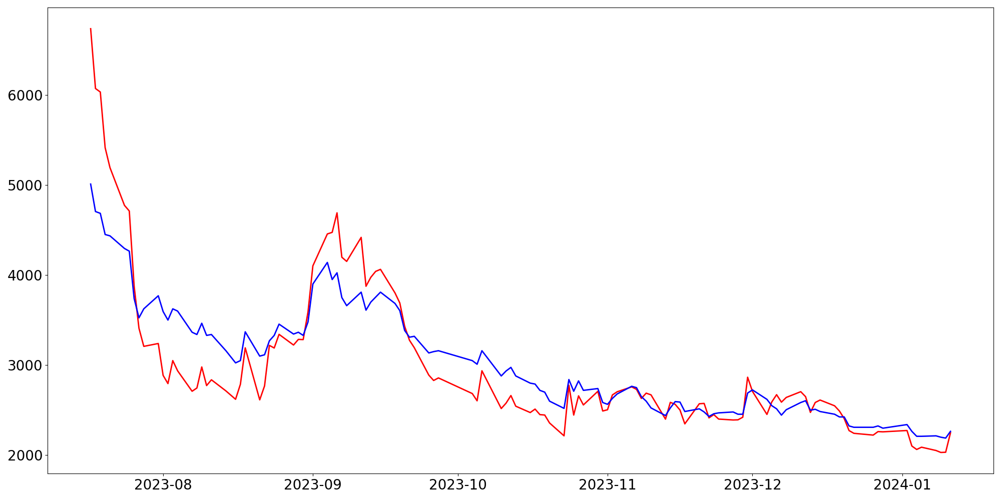 [ - : 실제값(종가) / - : 예측값(종가) ]