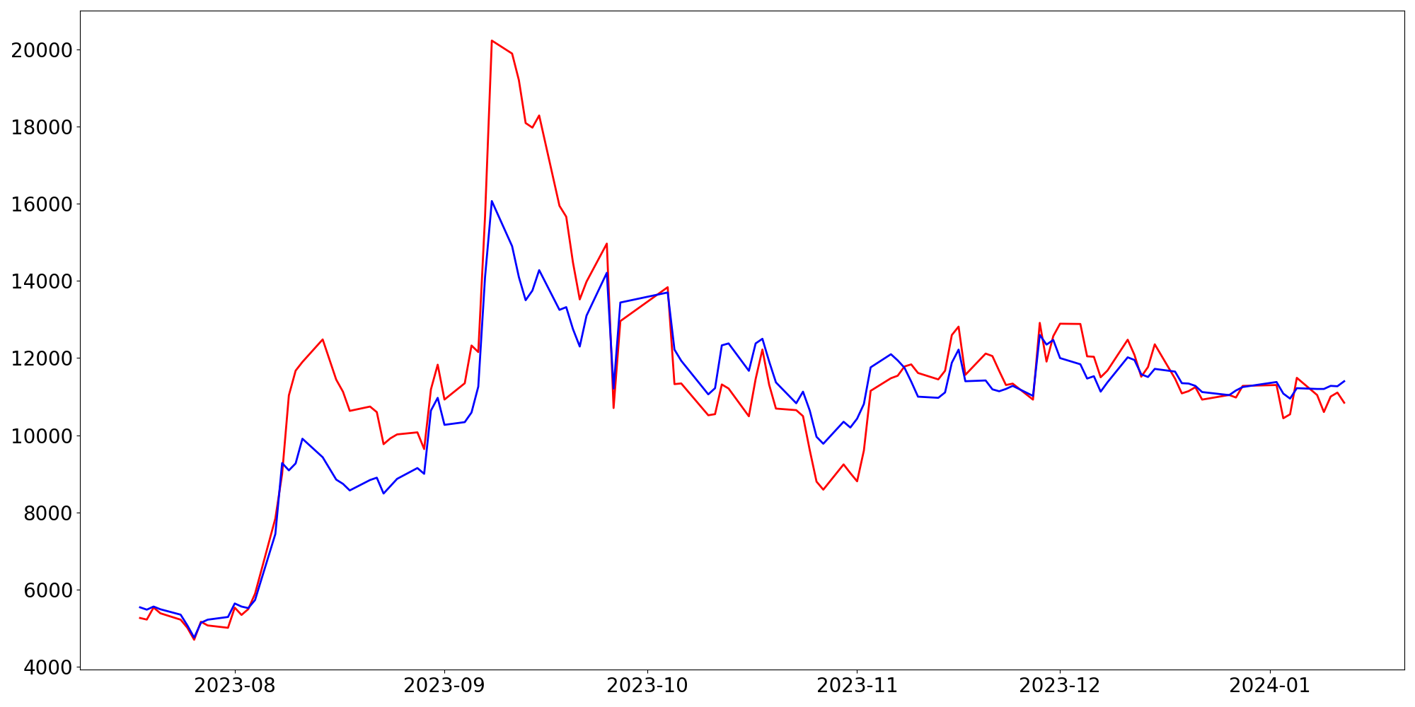[ - : 실제값(종가) / - : 예측값(종가) ]
