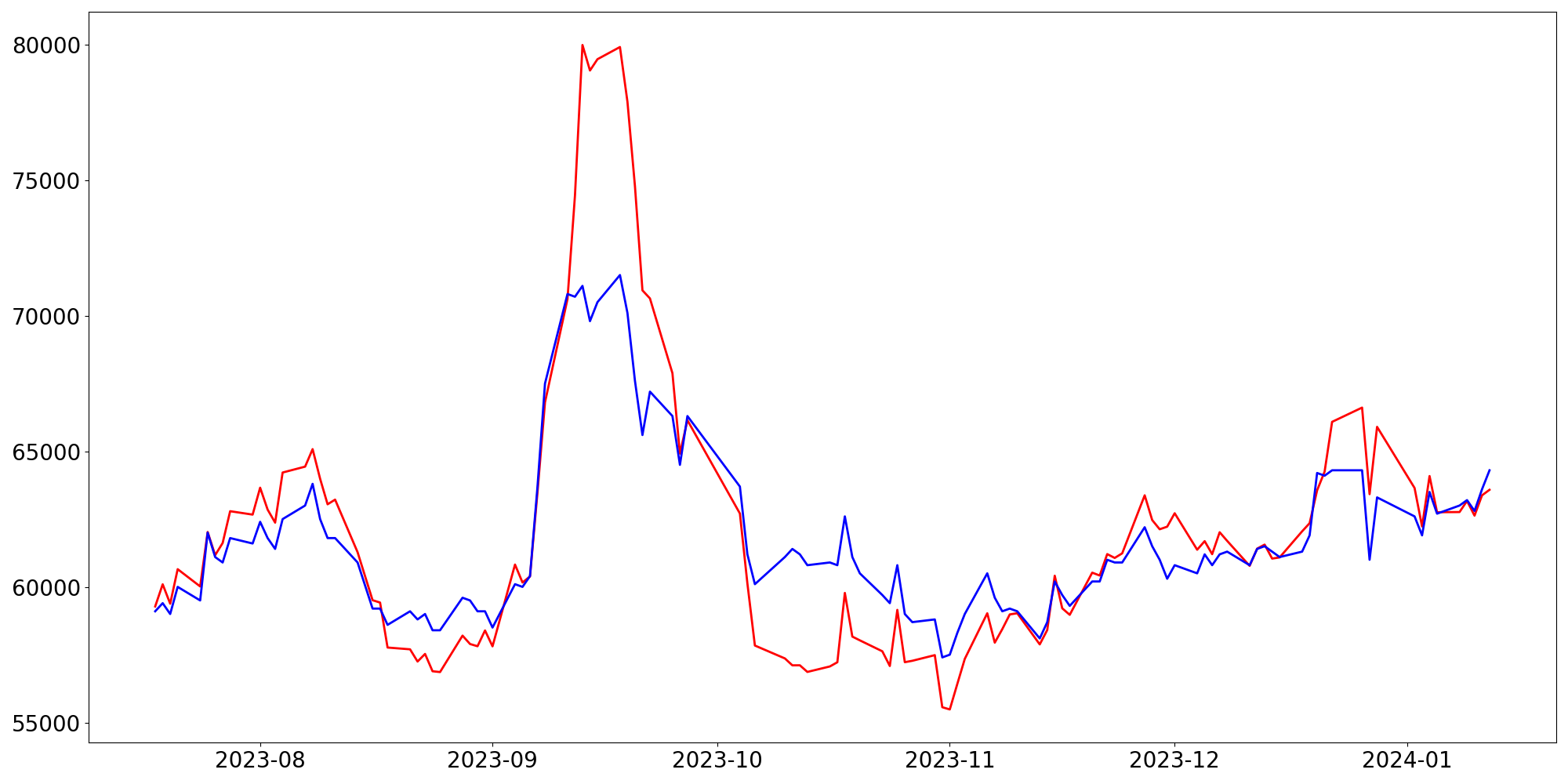 [ - : 실제값(종가) / - : 예측값(종가) ]