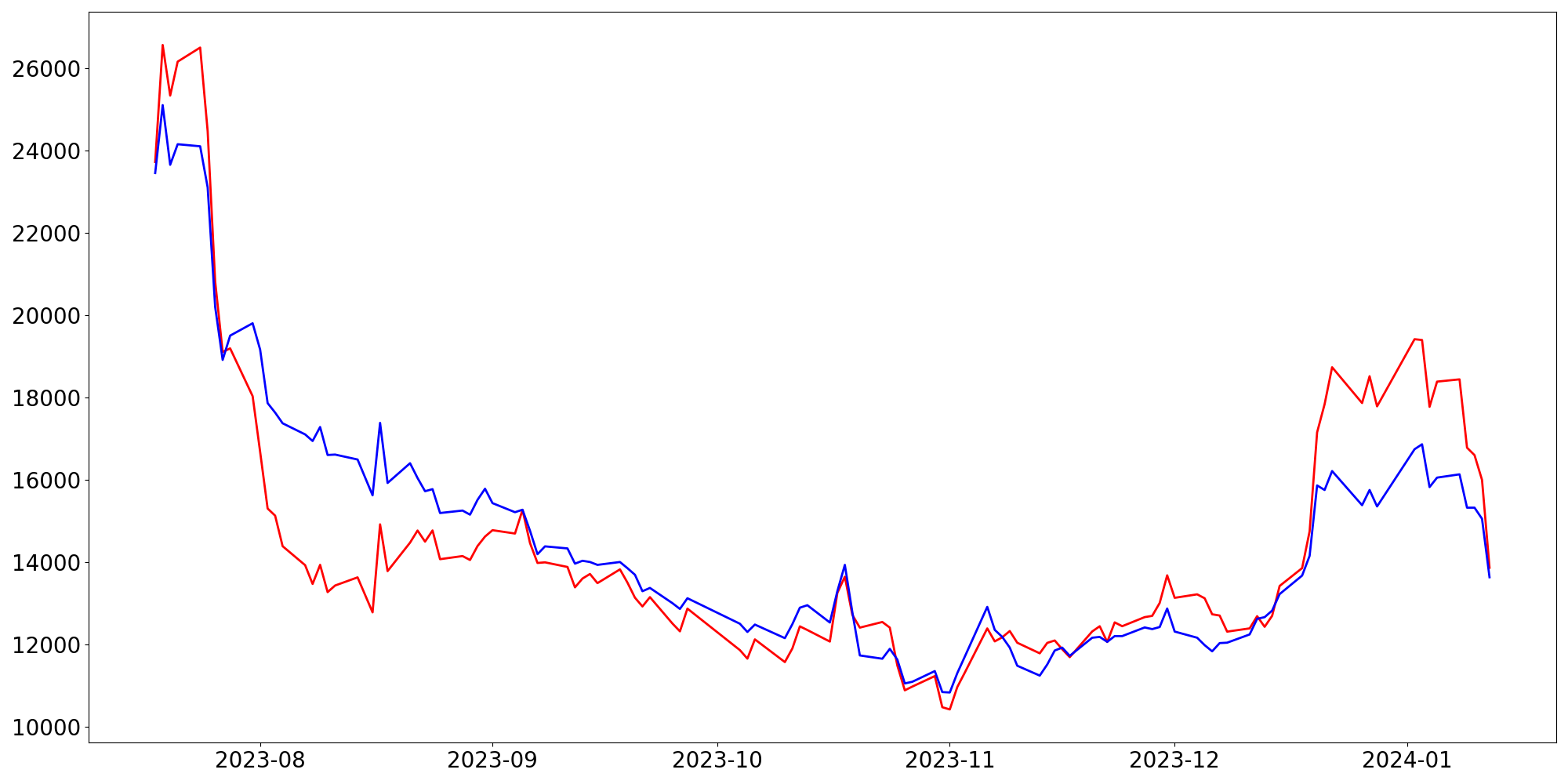 [ - : 실제값(종가) / - : 예측값(종가) ]